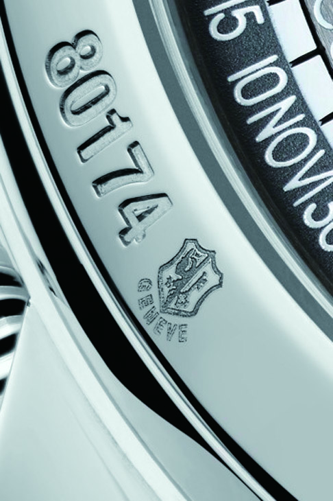腕錶錶殼邊緣與機芯均鐫刻日內瓦印記,表明其符合此認證標記對鐘錶原產地、精確度、耐用性與專業製錶技術的各項標準。