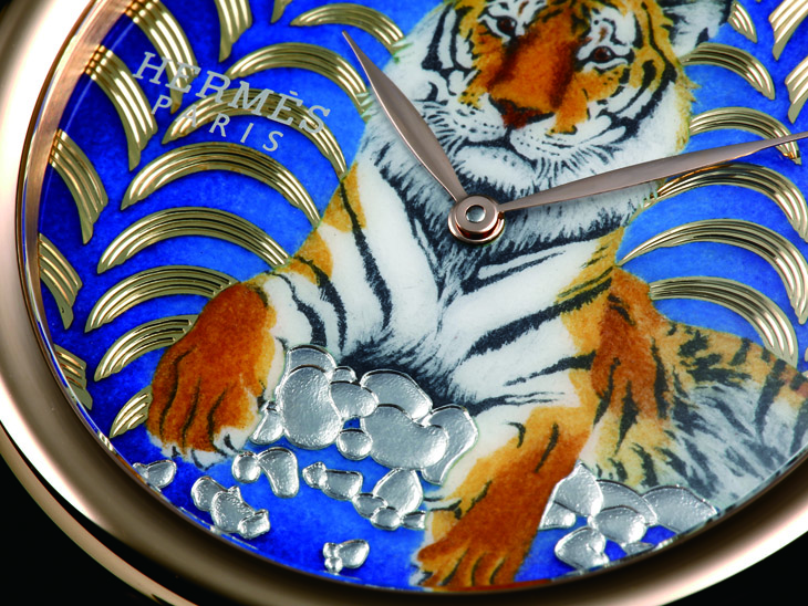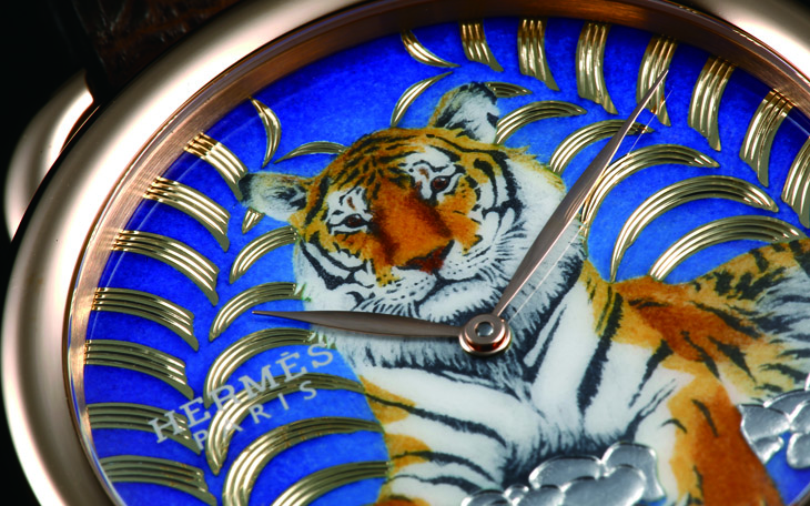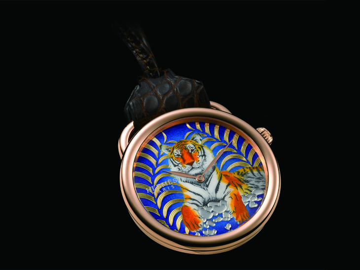 愛馬仕近年不斷融匯各式裝飾工藝入錶,甚至開放客製化大門催生絕無僅有的稀世珍品;前不久品牌便剛完成一只以「王者之虎」絲巾為摹本的懷錶作品,透過琺瑯與金雕工藝師聯手出擊,激盪出虎虎生風的傳神景致。