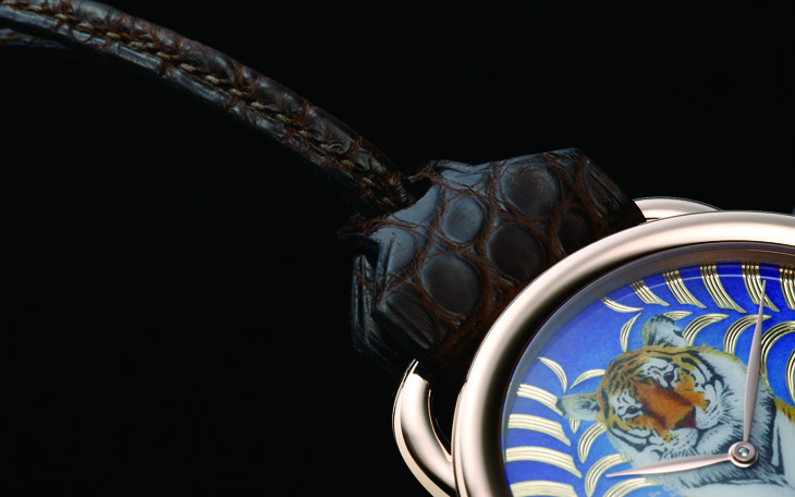 琺瑯工藝師不只將王者之虎絲巾上的主角順利搬入懷錶面盤,透過細膩筆觸及對琺瑯釉彩的精確掌握,更讓畫作中的猛虎釋放不怒而威的氣勢。