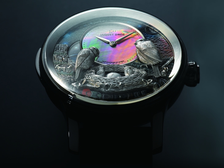 雅克德羅在鐘錶動偶方面擁有業界首屈一指的悠久歷史和技術,18世紀創辦人皮埃爾.雅克德羅開始製作自動機械人偶,而取材自然的機械報時鳥落地鐘或座鐘更是微型工藝的極致展現,籠中的雀鳥能夠鳴唱曲調並振翅擺尾,加上雀鳥本身也以琺瑯與寶石裝飾,創造出珍罕的藝術時計。21世紀的雅克德羅將古董鳥鳴鐘再度微縮,The Bird Repeater報時鳥三問錶以汝拉山區的山雀為主角,僅在方寸大小的腕錶空間內展現雀鳥動態,無論複雜度或視覺精彩度都屬上乘。