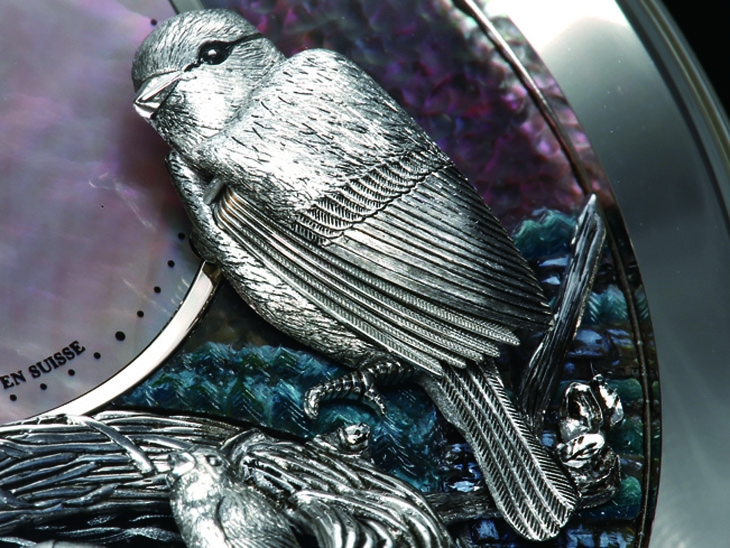 鳥翅底下可以看出有數層的金屬羽翼,當報時樂音響起時羽毛會一片片朝外伸展開來,形成一連串的連續動作,比起一般動偶錶更為複雜。