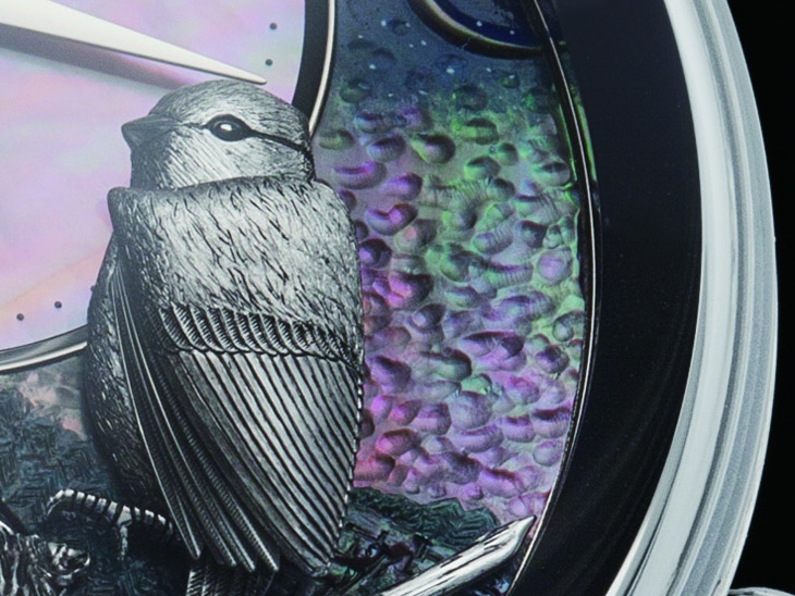 如此珍稀的報時鳥雖然絕對都是超限量,但也因應市場熱切歡迎推出了不同版本,有將雀鳥和背景施以繽紛色彩的彩繪版,或是奢華至極的玫瑰金鑲鑽版,而這只星空版是將雀鳥保留白金的金屬原色,再利用黑化處理製造出陰影層次,無論鳥身的羽毛紋理或是鳥巢的細木枝葉,都清晰可辨,背景夜空則是以珍珠母貝蝕刻後染色彩繪,從繁星點點到即將破曉的東方既白,天際還掛著一彎弦月,生動的詩意畫面,佈置出立體的動態畫卷。