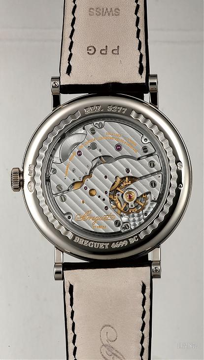 BREGUET寶璣的這款Ref. 5277是少數官方點明了有採用新發條材質的一款。5277於2013年推出,錶款使用的發條則是於前一年研發出來,這種素材據說是一種不鏽鋼,在同樣的長度、厚度和寬度下,它能夠提供更長的動力、以及更穩定的扭力,光這一點就已經是作為發條材質相當優秀的條件了,而且它還符合環保要求,不含鈷或鈹,並且是非磁性的;主發條的防磁不像擺輪游絲那麼要緊,不過環保倒的確是現代工業生產應當關注的議題,由此新材質這方面的特性同樣有其意義。