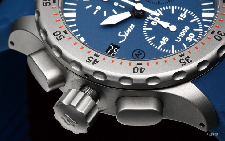 身為U系列的一份子,U1000同樣具備了系列的幾個重要特性,像是德國U級潛艇鋼材、Tegiment泰級硬化處理、還有錶殼上的受潮警示窗等等;這款藍面款是U1000在2014年推出的異色版,藍色算是去年的流行色,這款選擇的藍色看起來很舒服,跟錶款本身也毫無違和感,全消光的表面處理讓錶面毫無反光,在提升視讀性這點符合品牌的專業本位。倒是原本3點的小秒刻度和8點的Ar系統標示在黑面款上採用的是Black in Black的設計,也就是黑面黑刻度、黑字樣,乍看之下有些隱形的效果;以實用性來說,這幾個標示(主要是指小秒刻度)在計時潛水錶上算是次要功能,弱化它們的視讀性有減少干擾的意義在,然而到了這版面盤改成了藍色,這幾個標示卻沿用了黑色,原本的隱形效果就不明顯了,稍微有點可惜。