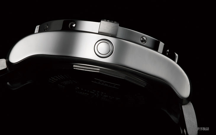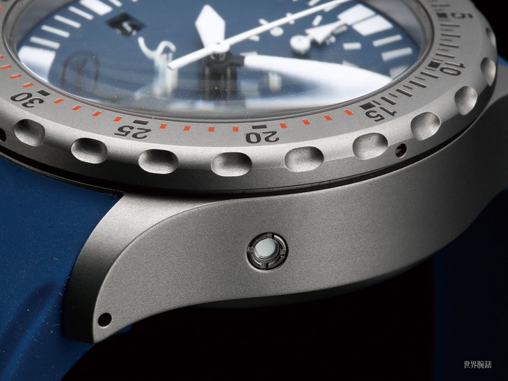 錶款的錶冠採用了旋入式的,以潛水錶來說這很尋常,比較厲害的是它的按把利用特殊構造,不用保護鎖也能達到防水效果,而且在水下同樣可以操作。