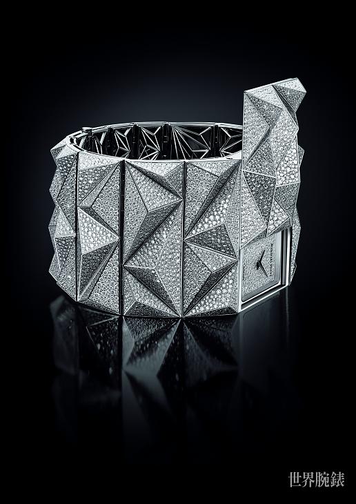 突破傳統寶石腕錶的外型,以龐克時代的金字塔型鉚釘為設計,考驗的不僅是鑲嵌工藝,更是跳脫格局的創意。