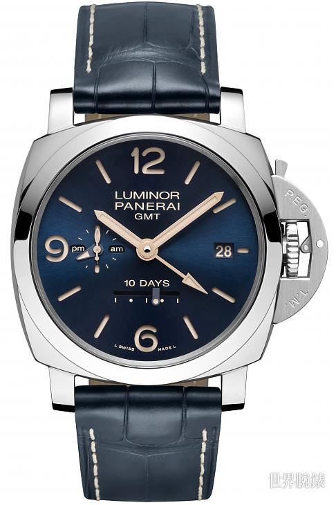 全新Luminor 1950 10 Days GMT Automatic 10 日動力儲存兩地時間自動腕錶(PAM00689) 配襯藍色鱷魚皮錶帶,由沛納海全球各專賣店獨家發售,此特別系列的所有腕錶均呈獻於優雅的藍色拋光桃木盒內。