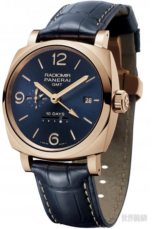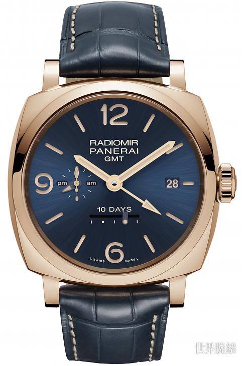全新Radiomir 1940 10 Days GMT Oro Rosso 10日動力儲存兩地時間紅金腕錶(PAM00659) 配襯藍色鱷魚皮錶帶,飾以紅金錶扣,由沛納海全球專賣店獨家發售。本系列所有腕錶均以優雅的藍色拋光桃木盒包裝。