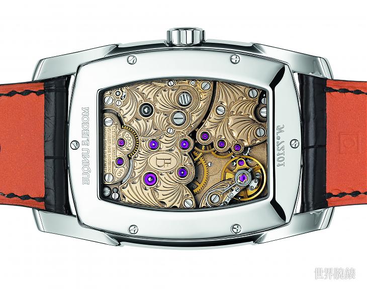 這款由全黃金打造而成的機芯, 它的裝飾工藝絕對不遜色於其技術的複雜性。在製錶過程中,由於黃金會粘附在工具上,雖有延展性,但亦極易變形: 這也意味著所有機器都必須重新校準,切割參數也需要全部改變,因而大大增加了鑄造的難度。而最後裝飾加工是最能展現機芯整體的風華, 也是工匠們無數個小時工作的結晶。手工雕刻的龍翼圖案巧妙覆蓋起每塊橋板,形成了交織纏綿的極致美感。淺栗色的錶盤素雅內斂,對比於機芯內裡的絕美景致兩者形成強烈反差。隱約中時間轉瞬而過,而與機芯同為純金材質的錶盤時標卻仿佛在召喚您打開寶盒,一覽其中的瑰寶。