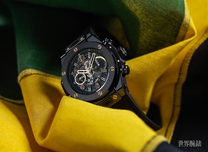 Hublot在2016年專為Usain Bolt而打造的Big Bang UNICO Usain Bolt計時碼錶,這也是由Hublot與Usain Bolt本人共同設計的全新腕錶系列,共有黃金錶殼與陶瓷錶殼兩種版本,以黃金及翠綠兩種色調搭配,展現出Usain Bolt本人陽剛而動感的個性。錶帶內側印有牙買加國旗,向Usain Bolt的家鄉致敬。這只全新計時碼錶搭載Hublot自製Unico機芯,具有飛返計時碼錶功能,可精準紀錄各項運動賽事。兩只計時碼錶皆採限量發行。