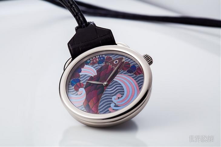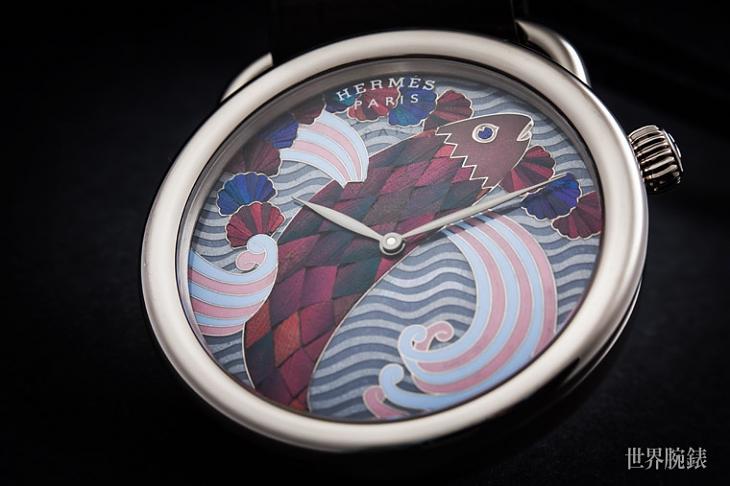 Arceau Pocket Ailes et Ecailles懷錶面盤是愛馬仕再度挑戰高難度,首次挑戰一般慣用於雕刻傢俱上的甲蟲鞘翅細工鑲嵌技術(Scarab Beetle Elytra Marquetry)結合常見的「大明火」技法燒製而成的微繪琺瑯,將Pierre Marie設計的沙灘巾圖案濃縮在僅43mm的面盤空間,可想而知其難度有多高。