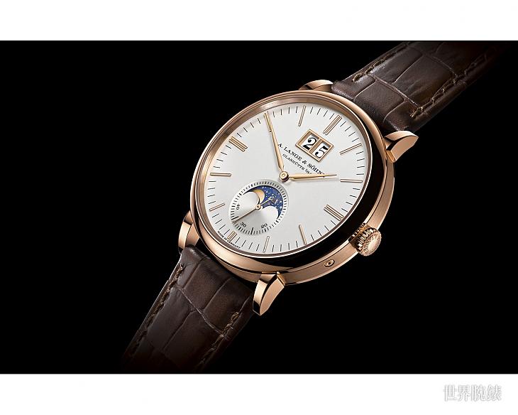 全新SAXONIA系列腕錶,設計簡潔,具有精準可靠的月相顯示和別具一格的朗格大日曆顯示。18K金框架的雙視窗設計,分為個位和十位,數字盤大日曆顯示設於12點鐘位置下方,顯而易見。小秒盤則設於6點鐘位置,其上半部為月相顯示。SAXONIA MOON PHASE裝配L086.5型自動上鏈機芯,配合七階段傳動裝置,月相顯示連接小時齒輪,準確率高達99.998%。實心18K金深藍色月相盤經特別專利塗層過程處理,錶匠會以激光切割出至少852顆星星。鉑金950離心輪為上鏈過程提供充足動力,單一發條盒提供長達72小時的動力儲存。SAXONIA MOON PHASE匯集經典螺絲擺輪、朗格擺輪游絲及以未經處理德國銀製造的3/4夾板,在手工精心修飾的機芯中亦裝設手工雕刻擺輪夾板,堪稱傳世經典。