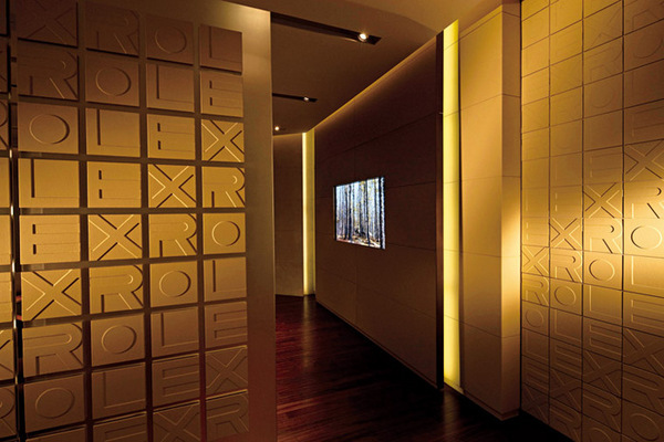 鑲板上隱約浮現出 ROLEX 的字樣,精心特製的隔間材質搭配美妙的燈光與木質地板,極具質感。