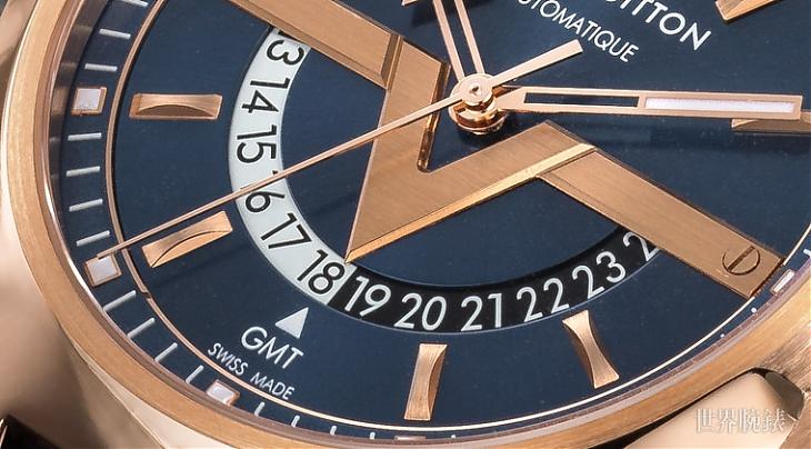 ▲面盤下半部的大”V"造型實在很搶眼,大"V"表面的打磨還是LV採納緞面刷紋的方式完成,且頗具巧思的索性將大"V"當作指針,指示出第二地時間,並在小時轉盤上加入白與黑兩段顏色,分別代表白天與黑夜,讓使用者一目瞭然。