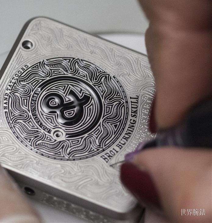 雙層錶盤設計所帶來的視覺深邃感更突顯出“紋身”裝飾圖案正中央骷髏圖案的生動逼真、栩栩如生。骷髏圖案由一塊金屬壓印而成,這一工藝一般用於製造硬幣和勳章,目的是創造出逼真的浮雕。這是一項漫長艱鉅的工作,雕刻師或漆匠需要耗費數小時才能完成一個錶殼。當這些創作階段完成後,黑色漆面便產生光影交疊與明暗對比,錶盤錶面覆蓋的黑色夜光材料則進一步突出骷髏圖案,彰顯出它毫無畏懼的眼神。
