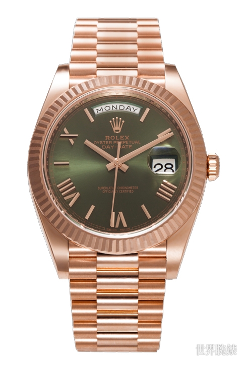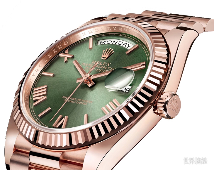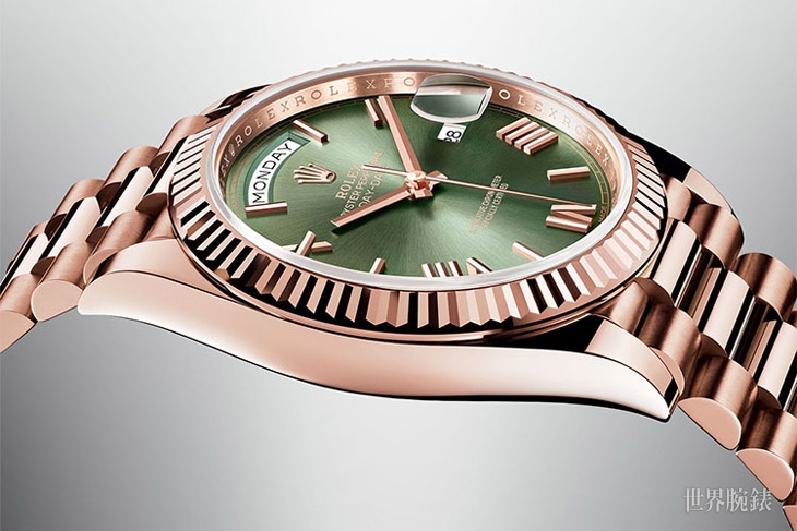 1956年,勞力士推出Day-Date,首只能完整顯示星期文字的錶款,Day-Date系列從此成了品牌的旗艦錶款。因此在Day-Date 60週年所推出的錶款,勞力士精心採用了品牌標誌性的綠色面盤,勞力士各色盤中綠色面盤最能大賣熱銷,具保值性又具話題性。面盤上的時標和Logo皆以18K玫瑰金打造,並運用了多切面的設計,讓佩戴者能多角度和清晰地讀取時間。另外最顯著的亮點在12點位置顯示完整的星期文字。這特別的顯示方式只有他們家有,而且會隨著在不同的地區推出不同的語言顯示。