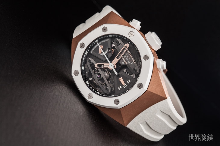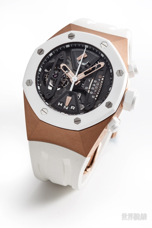 要打造出一只天王等級的手錶勢必得運用最高等級的材質。從第一只概念型錶款起,愛彼就嘗試了超合金、鍛造碳合金、陶瓷各種組合。那今年全新錶款採用了白色陶瓷錶圈與玫瑰金錶殼的組合,頗新鮮的一種搭配,與愛彼今年要打造黃金軍團的主題吻合。玫瑰金相較於鈦金屬更柔和一些少了剛烈的感覺,再搭配上白色的橡膠錶帶,第一眼看上去就很摩登時尚又不失貴氣。