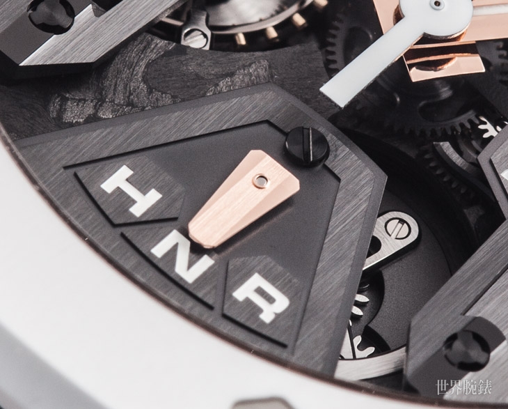 ▲ 6時方位的H-N-R為錶冠位置顯示器,位置R顯示上鍊位置、位置H顯示時間調校位置,結束調整後則務必推回正常位置N。