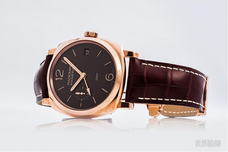 570使用的紅金是一種特殊合金,與一般玫瑰金不同,其採用較高比例的銅及少量的鉑金去煉製,稱為「5Npt」。除了它的顏色及高級質感,其抗氧化特性也是拿來製作高級腕錶的最佳原料。48mm枕型的拋光紅金錶殼,設計靈感取自30年代品牌為義大利海軍突擊隊打造的錶款,招牌的三明治面盤上除了有夜光阿拉伯數字、時標、小秒及日期顯示,還特別設計經緞光處理的棕色陽光放射紋,能折射出迷人光芒。「大尺寸氣勢搭配簡練外型,是我很喜歡的款式,你會發現我的錶都是簡單、經典,沒有計時和多功能複雜款。」