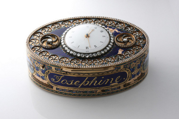 ▲ 18 世紀超華麗時計寶盒 外觀底色採用藍色琺瑯裝飾,又以金邊勾勒出華麗線條,除了上方鑲嵌寶石更顯貴氣, 側邊寫上 "Josephine" 的字樣,另一側以琺瑯描繪出的景緻令人心曠神怡。