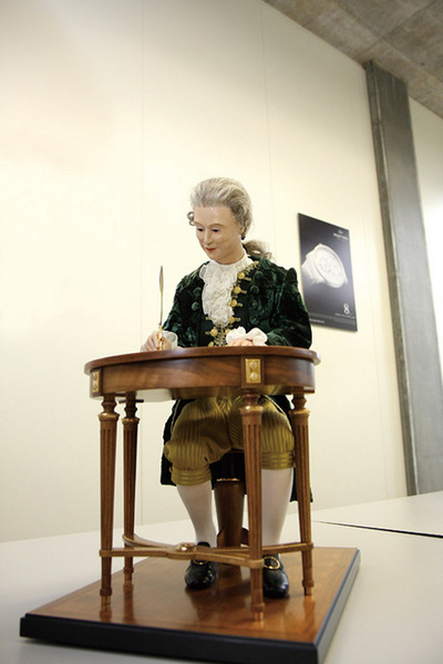 前面有稍微提到創辦人皮埃爾與兒子設計的三個機械人偶,在 1775年介紹給法王路易十六(King Louis XVI)與瑪麗皇后(Queen Marie Antoinette)後聲名大噪,當中第一個具有書寫功能的活動人偶是由創辦人親手設計的,以其兒子亨利路易三歲時的模樣打造,可以上下左右書寫 40 個字母,非常神奇,現藏於瑞士的納沙泰 爾藝術與歷史博物館。而在此行參觀位於拉德紹封的雅克德羅工坊時,廠方則展 示了復刻版的機械人偶,雖然造型與尺寸都不盡相同。人偶服裝的絲質上衣、皺 褶、袖口都很講究,背心的配釦與刺繡裝飾華麗一點也不馬虎,下半身的馬褲線 條分明收邊仔細,連鞋子都做得很有型,而人偶所坐的桌椅也依循古典風格,採 用上等原木製作打磨而成,桌面的木紋、桌腳的刻紋都很用心。當人偶作動後, 可寫出 "JD" 的品牌標誌,就如同兩百年前的人偶,可以上下左右移動筆觸,不僅寫出字母更是畫出圖案,雖然品牌機械人偶的獨特早已名滿天下,但實際看到人偶完成的作品時,還是令人驚呼連連。此外,機械作動時,人偶不只是進行手部的動作,就連眼睛也會眨,如實反映真人若進行相同動作時可能有的身體反應, 十分有趣。