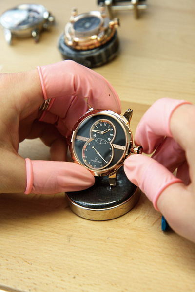 儘管在經營階層上有所變動,但對於雅克德羅進行變革的方針大體上是沒有影響的,除了前面所提的強化品牌形象,包括新網站的推出、新廣告的露出,為的是希望強化大眾對創辦人皮埃爾.雅克德羅(Pierre Jaquet Droz,1721∼1790 年)的印象,特別是這位生於十八世紀的製錶天才,受到當時啟蒙運動思潮影響,勇於創新、敢於實驗,在 1738 年在拉紹德封(La Chaux-de-Fonds)創立了第一間錶廠, 爾後作品受到西班牙王室歡迎,並投入高複雜手錶功能的開發。到了 1774 年又與兒子亨利.路易(Henry-Louis)在倫敦創立了第二間錶廠,隔年發表出三個複雜機械人偶——書寫人偶、音樂人偶與繪畫人偶震撼世界成為經典,後面會另闢篇章介紹。此外,在琺瑯彩繪、寶石鑲嵌等裝飾藝術錶款上,成功攫取歐洲、俄國 甚至更遙遠的東方中國皇室貴族的目光,也在日內瓦開設了第三間錶廠,成為雄霸一方的製錶品牌。風光一時的雅克德羅之後光芒不再,甚至被外國資本收購, 直至 2000 年由 Mr. Hayek 收歸 Swatch 集團後才逐步喚回過去的光榮回憶,更重要的是,十年之後的 2010 年雅克德羅位於拉紹德封的製錶工坊風光開幕,面積為兩千五百平方公尺,主要著眼於增長迅速的市場需求,選在拉紹德封更是別具意義,一方面品牌首間工廠即是創立於此,再者與集團內其他資源能夠策略聯盟、互利共享。除了此次前往品牌 '10 年新落成的製錶工坊外,本刊也一併拜訪了負責品牌錶殼製作的工廠 FAVRE et PERRET。在 1999 年被併購的 FAVRE et PERRET 錶殼廠,先前受託客戶高達 130 個左右,不過以供應集團內部貴金屬錶殼為主,主要客戶為雅克德羅、寶璣、寶鉑與歐米茄,及少部份蒂芬尼與格拉蘇蒂的委託,從此陣容不難想見 FAVRE et PERRET 的極高水平。由於廠內仍有些技術 Know-How 不方便公開,像是其拋光技術就很全面,所以僅供參訪無法拍攝,不過基本上像是雅克德羅與廠方之間的合作,就是以品牌提供設計交由廠方畫出技術圖進行溝通, 再依序進行錶殼樣品製作等程序,每一程序基本上都有雅克德羅主導認可,像是品牌錶殼的獨特編號亦是由廠方代為操刀。