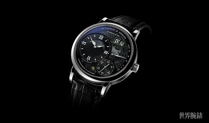 ▲朗格抽換掉原有的乳白色面盤,改用黑色半透明藍寶石水晶作為部分面盤,使得若隱若現的魚鱗打磨搭配招牌的大日期,以及特別的夜光塗料,可在黑夜中看見燿燿發光的月相、大日期與時、分顯示,相當吸引人。