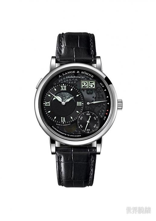 朗格史上第三只夜光腕錶,全球限量200只,Grand Lange 1 Moon Phase這只同時具備夜光、月相與招牌大日期的正宗朗格,是品牌首發款!採用貴金屬的鉑金作為錶殼,專利夜光塗層與黑色半透明藍寶石水晶面盤的使用造就了它粗獷中帶有一絲細膩的樣貌,是朗格少見的優雅與陽剛兼具的款式,L095.4機芯的無比精準與上乘工藝更是完整體現了德式的魔鬼細節!