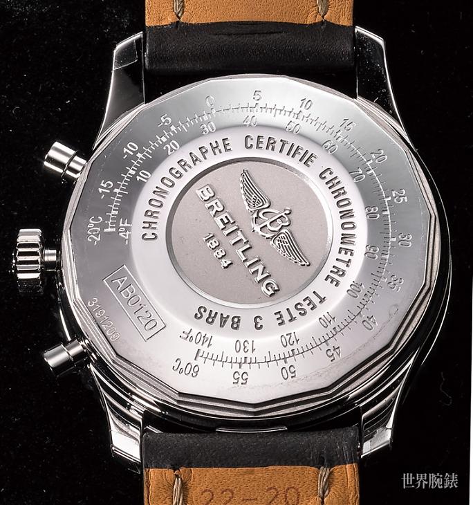 ▲現行的一般版採用實底蓋,底蓋外圈刻的是攝氏和華氏溫度的對照表。搭載百年靈自製的B01機芯,這也是目前市面上的自動計時機芯當中號稱「怎樣都玩不壞」的優秀機種,另外當然也具備了C.O.S.C.。