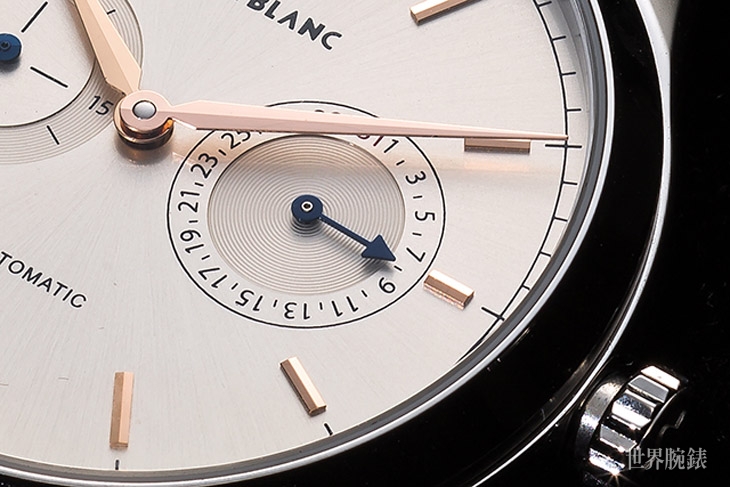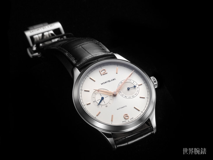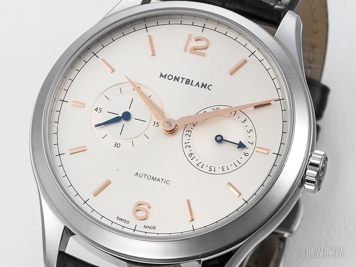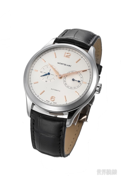 這只錶款參考了1948年發表的Minerva Pythagore計時錶,萬寶龍沿用了經典雙計時盤的設計元素,將一般的日曆視窗作法改換成指針式日期顯示副盤,而另一側則為小秒盤。簡單如一只僅帶有日期顯示功能的手錶,萬寶龍以顛覆傳統的形式來呈現充分地將日期功能的特色表現在面盤上,品牌獨到的做法令人讚嘆。
