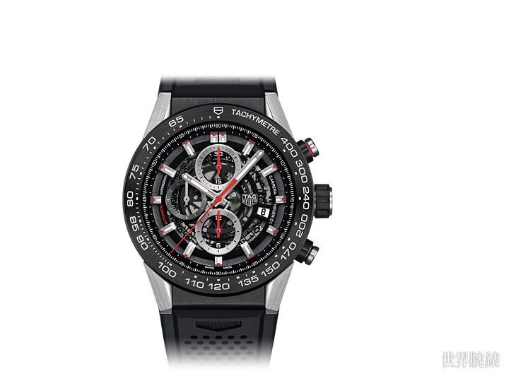 ▲鏤空的錶盤錶盤上鐫刻白色「CARRERA HEUER 01」、「CHRONOGRAPH」和紅色「AUTOMATIC」字樣