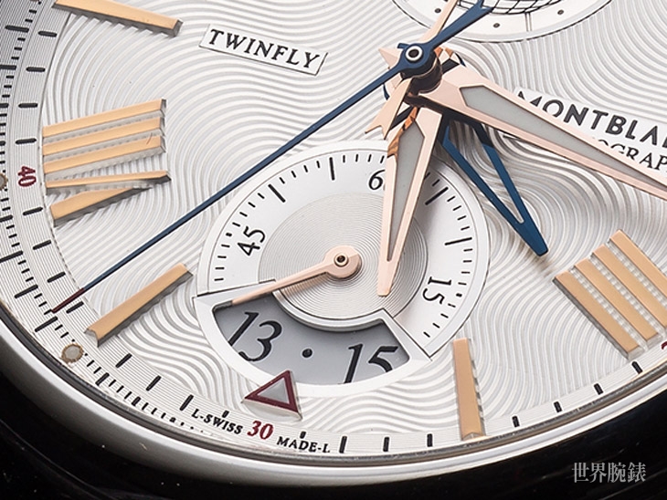 ▲ 由於此腕表採用雙中軸計時指針顯示計時分鐘及秒數,故表盤內不設任何累計盤,計時刻度圈均排列於表盤外緣,外圈為密分秒數,內圈為分鐘刻度,計時指針分別以兩色代表,計時秒針為配紅色針尖的藍鋼指針,計時分針則呈玫瑰金色。