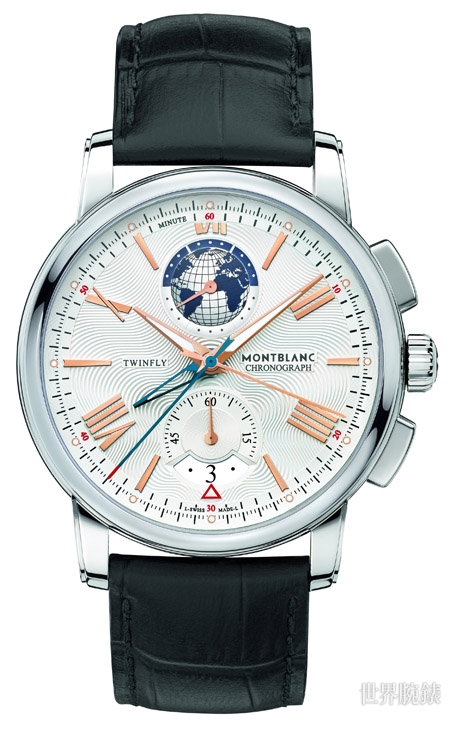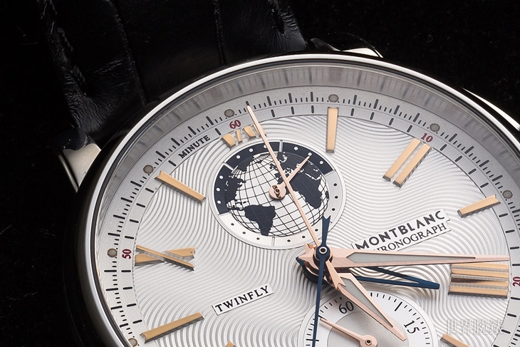 4810雙飛返計時錶110周年限量版是一只很酷的錶款,此話不僅是指造型或功能,而是較不常見的報時呈現方式,你可以看見共有五根中央指針。其中兩根藍色劍形指針為顯示第二時區時間。這一種讀時方式清晰明僚,也可避免增加副盤或複雜化時標外圈的做法。第二種讀時的方式,就是看位於12點鐘方位的地圖盤,繞著這地球盤的是24小時刻度圈,上下半圈分別以銀色及深藍色代表日夜,加上一般慣例是以6時為日夜交替的界線,故也可從之知第二時區的實際時間及日夜。