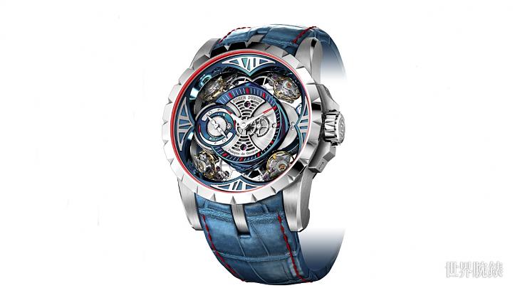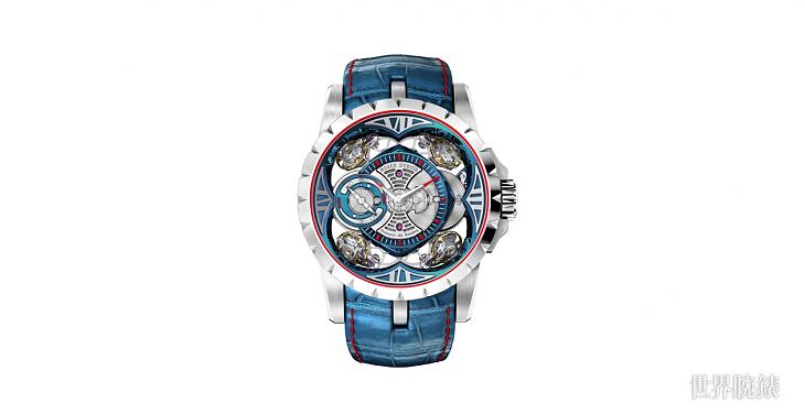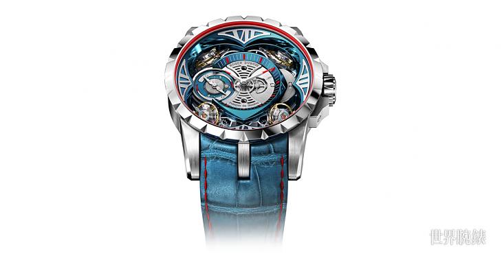 在此款大膽新穎的Excalibur Quatuor四擺輪游絲腕錶上,微光閃爍的鈷鉻合金與覆有藍色 PVD塗層的機芯桶形框架、橋板、錶盤、小時 刻度以及鱷魚皮錶帶形成宜人的對比。鮮亮活潑的紅色和白色則分別點綴著其他元素: 具有汽車測速錶風格的分鐘圈刻度、白金鏤空指針和填充SLN螢光塗料的紅色針頭,以及錶帶的紅色縫線。