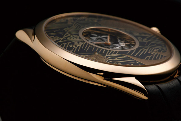 VACHERON CONSTANTIN 江詩丹頓的藝術大師系列近期的產品就在這個議題上拉出了不同的高度, 像是 '11 年的龍紋系列,或是這次的蒔繪套錶。我仍然覺得要將「藝術」兩個字加在手錶上有點太沉重了,而且這也不是我們對手錶的期待,事實上只要一份獨特的匠心就可以讓它跳脫一般工藝品的層次了,而這款蒔繪錶剛好體現了這種力量。漆藝錶在市場上並非絕無僅有,各家品牌的技巧和美感也都有可觀之處,但是他們在整合「漆藝」 和「手錶」兩個主題時卻總是差強人意,漆藝這項裝飾工藝和手錶這項工業產品之間老是有種貌合神離的感覺。江詩丹頓的蒔繪錶並沒有直接將漆 藝做在面盤上,而是在錶面外圈獨立出一圈環狀 空間來呈現蒔繪技法,時、分針則縮小在中央的鏤空部份;這種作法其實很像懷錶時代的裝飾, 重點是它讓手錶這個「載體」以最斯文的方式表現工藝內容,我認為是目前類似產品中最高明的。