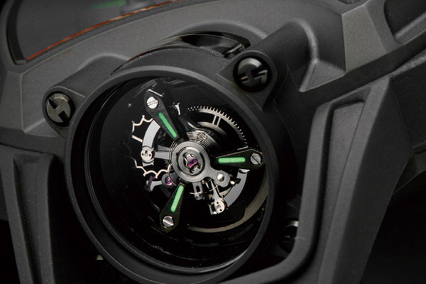 錶款的下方有一垂直陀飛輪,令人想起之前 BNB 為 CONCORD 製作的陀飛輪;框架上塗有夜光塗料,陀飛輪中鏤空的擒縱輪仍然是過去 BNB 的樣式;另外陀飛輪側面的視窗是數位秒鐘顯示。