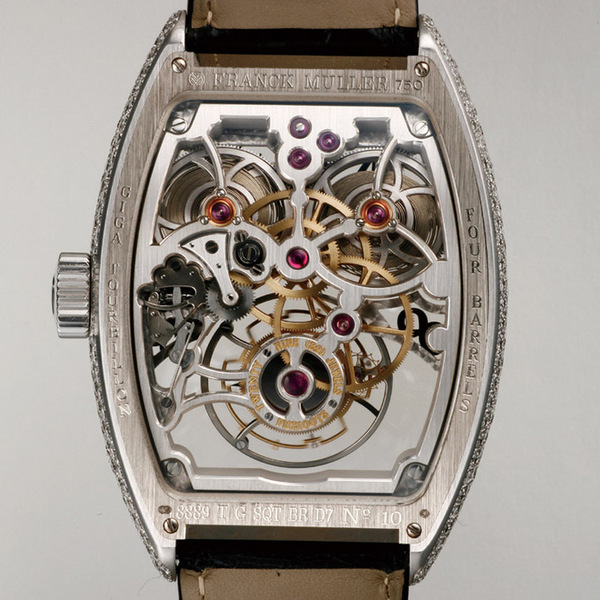 這款 Giga Tourbillon 是 FRANCK MULLER 2011 年的新款;錶如其名,這款的特色就是大,Giga Tourbillon 陀飛輪框架的直徑高達 20mm,是目前市場上最大的,幾乎有一般陀飛輪模組的兩倍大。大尺寸的陀飛輪需要許多配套,首先是擒縱系統,錶款的擒縱輪做了重度鏤空以求輕量化,擺輪的震頻也降到了 18,000vph(目前常見的陀飛輪模組多是 21,600vph);動力的部份, Giga Tourbillon 採用了四發條盒,分別是兩對串聯的發條盒,從鏤空面盤上就看得到,多個發條盒不但提供了驅動巨型陀飛輪所需的龐大扭力,兩對發條盒之間彼此並聯也能夠恆定輸出的動力,而且四發條盒的動力儲存在驅動陀飛輪之後還綽綽有餘,儲能有 10 日之久,即使對簡單的三針錶來說也是超長的動力儲存。