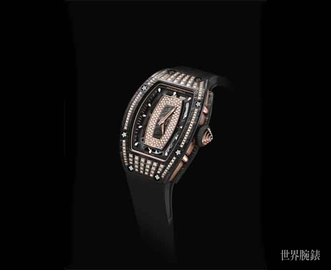 這款腕錶採用全新NTPT碳纖維鑲鑽做為主錶殼,搭配5N玫瑰金錶圈。錶殼呈現的波浪狀圖形產生獨特的視覺效果。 NTPT碳纖維材料由多層平行細絲構成,細絲則由碳纖維分離得到。這些厚度不超過30微米的薄層先被浸在樹脂中,再經過特殊的機器織成,層與層之間有45°角的交錯。再經6 bar壓力加熱到120°C後,NTPT碳纖維材料就可以被送到Richard Mille位於Proart的錶殼工廠用數控機床進行加工。