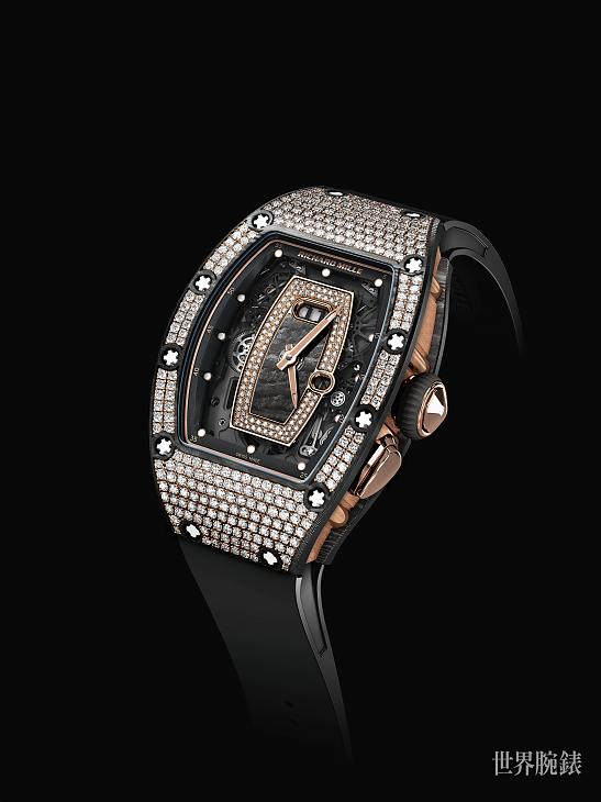 NTPT碳纖維材質鑲鑽是Richard Mille品牌的全新嘗試。金屬材質可讓工匠們用傳統的工具來製作固定鑽石的金屬爪,而NTPT碳纖維卻不同,它的硬度和抗劃特性必須使用配備鑽石磨俱的專用數控機床,方可完成鑲嵌相關工序。全手工拋光的紅金或白金材質金屬爪是單獨製作的,依序嵌於錶殼上排布細密的直徑0.25mm小孔,從而將250顆至臻美鑽牢牢固定在RM 037腕錶上,完美詮釋品牌高超工藝。配備Richard Mille自產機芯,並首創採用NTPT碳纖維材質鑲鑽工藝, 全新的RM 07-01和 RM 037女士腕錶成為了平衡尖端技術,融合精湛工藝的佳作。