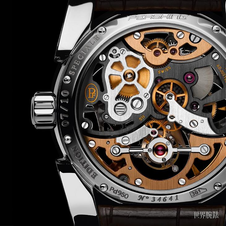 ▲國際通用的鈀金戳記為「Pd」或「palladium」,以純度之千分數字表示,規格分為Pd1000、Pd950、Pd900、Pd850等。(圖為PARMIGIANI Pershing Tourbillon Skeleton)