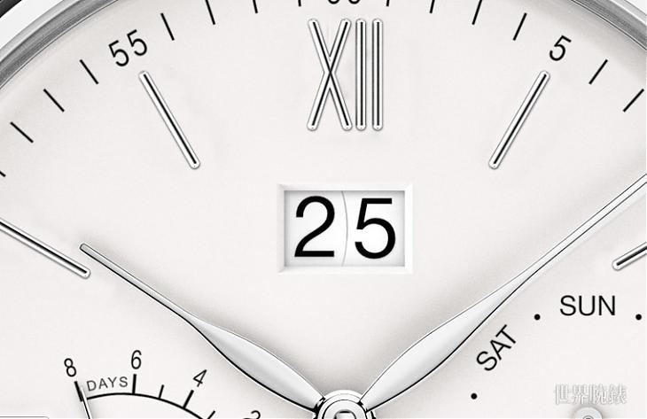 大日期要算是這款的焦點功能,機芯在這裡採用的是同心圓式雙盤大日期,一般來說這種形式的大日期尺寸較小,但好處是兩盤之間的接縫窄而且沒有高低差,算是利多於弊,而且由於59系屬於大型機芯,因此儘管它的日期以比例來說算是小的,但實際尺寸仍然相當夠份量,唯一比較可惜的是數字的字型稍嫌單薄,只是這個字型是Portofino的標準字,套用它自有其邏輯。