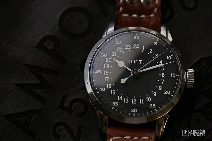 首先以外型來看,這只腕錶是G.C.T 24小時制懷錶入殼,壓克力鏡面使整體更有復古的感覺。在黑色面盤上有特殊的24小時顯示,數字、時標和指針皆採用白色呈現,藉由深色面盤的襯托,跳脫的對比色使閱時更清晰且容易。桃心時針搭配尾端些微下垂的分針與秒針,細節處精心的小設計使腕表在視覺上給人更為活潑的觀感。