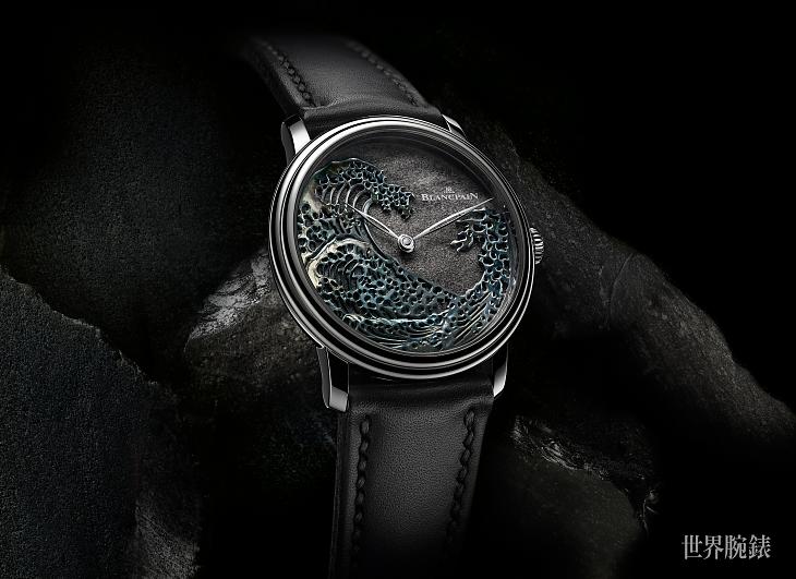 而寶鉑提煉出了畫作裡的視覺中心“鷹爪浪”,再重新構圖,使其符合圓形錶盤的審美旨趣。製作錶盤時,寶珀首先將白金巨浪鑲刻部件固定於赤銅基料上,之後浸泡於東瀛rokushō銅綠鹽中,為海浪營造獨特的綠灰色澤。同時,對部分浪花進行拋光處理,在停格瞬間,增強巨浪捲湧的質感,最後再將整片白金巨浪鑲刻固定於墨西哥銀曜石上。這一系列的步驟完美打造出“靜中見動”的視覺美感,與色調變幻的神秘錶盤交相輝映。這使得脫胎於名畫的寶鉑巨浪,竟具有了甚至超越原作的驚人之美,令人折服。
