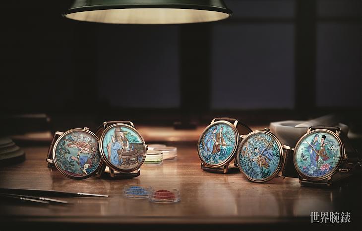 為了再現中國畫的意境,寶鉑的琺瑯大師也十分用心,從琺瑯原料階段開始進行了無數次嘗試,終於調配出最具水墨色彩與質感的琺瑯。近距離欣賞畫作細節,其雅緻的色彩暈染、細膩的人物勾勒、和諧的場景構圖,讓人很難想像,這些在方寸盤面上栩栩如生的中國主題琺瑯畫作,竟出自遙遠的瑞士大師之手。在掌握了中國繪畫的技法之後,琺瑯大師沒有停留在視覺美學階段,而是去挑戰更加困難的敘事效果,領悟到故事的內容,然後將梁祝傳說的關鍵場景:草橋結拜、同窗共讀、十八相送、樓台相會、化蝶比翼一一講述出來。也正是從此刻開始,這一套主題腕錶,跳出了狹義的腕錶作品領域,成為了真正的藝術品。