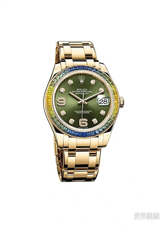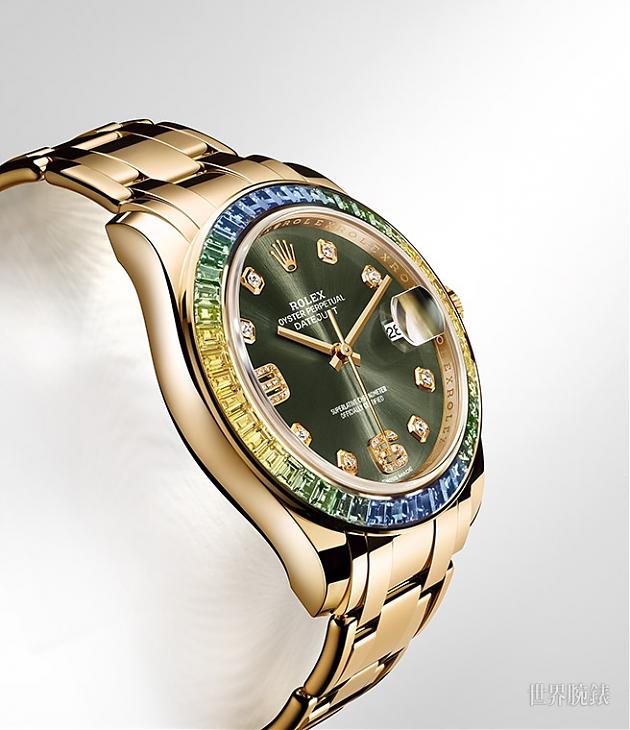 貴為勞力士頂級珠寶腕錶系列的Pearlmaster,除了保有勞力士堅固、性能絕佳時計品質的內在,Pearlmaster還被飾以華麗奢華的外觀,無論是內在還外在,都展現勞力士誠意十足的製錶功力。全新的Pearlmaster 39可謂是結合了勞力士的創新與經典,讓人眼前一亮的是向來設計走平實路線的勞力士竟然大膽採用橄欖綠面盤搭配華麗的漸層式絢彩寶石打造的錶圈並依附在經典的蠔式外型上,勞力士果真有它一套。