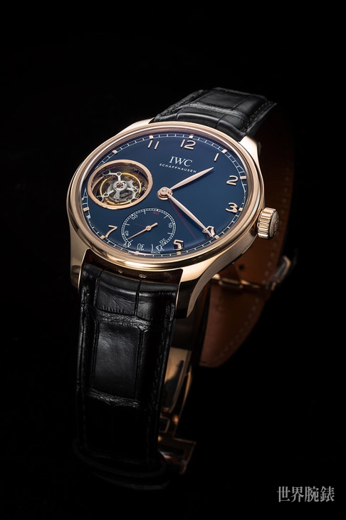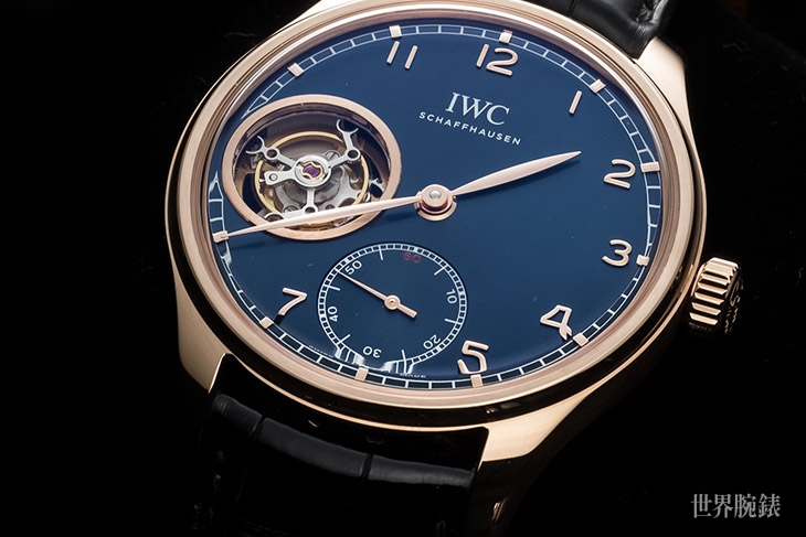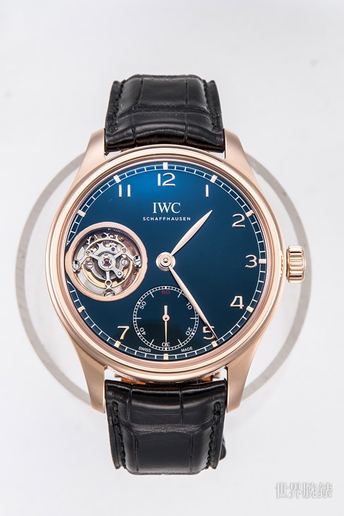 沿用標志性的嵌入式阿拉伯數字、鐵軌式分鐘圈和纖細的葉形指針等特點,承襲了來自上世紀30年代的原版葡萄牙腕錶的特色。陀飛輪裝置開設在九點鐘方位,造型特殊的籠架有IWC一貫的味道。小秒盤則設於六點鐘方位,60秒的刻度以紅色印製,則沿襲了較古老的刻度繪製習慣。
