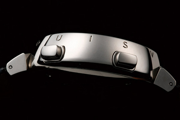 利用錶殼側面的按把可以快調二地時間;Tambour系列的錶殼本來就很有存在感,這款的按把被擠到逼近錶背的邊緣,更是突顯出錶殼的厚度。