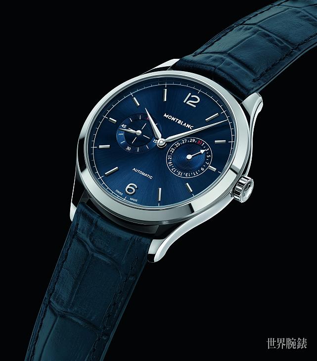 這只日曆錶的創作靈感來自20世紀50年代美耐華計時碼錶經典的雙小錶盤設計。它直徑40毫米的拋光精鋼錶殼時尚纖薄,厚度僅為9.85毫米,搭配內側經緞紋磨砂處理的弧形錶耳,體現萬寶龍對細節精益求精的追求。另外,它所搭配的精緻錶盤更突顯了卓越的設計水準。仿古藍色錶盤裝飾太陽放射紋圖案、刻面劍形指針、鍍銠鑲貼時標以及醒目的阿拉伯數字6和12刻度。錶冠頂部浮雕有極易辨識的萬寶龍標識,與錶盤相呼應的仿古藍色鱷魚皮錶帶則由義大利佛羅倫斯的萬寶龍Pelletteria皮具工坊製造。