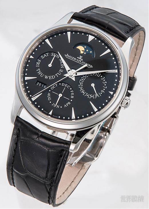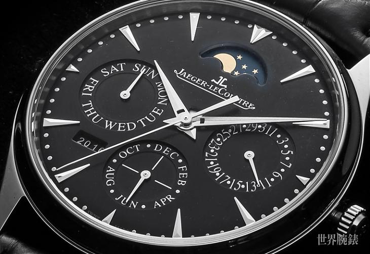 錶款的萬年曆顯示採用三眼時間顯示,三點鐘位置是日期顯示,六點鐘位置是月份顯示,而九點鐘位置則是星期顯示,介於七~八點鐘是四位數年份顯示,雖然將年份採用四位數字顯示已經不是頭一次,但積家將這項功能導入自家超薄萬年曆中,大大的簡化了時間顯示的讀時性,加上位於指針中軸上方積家特有的調校警示窗,以及十二點鐘位置的月相窗,可以說萬年曆該有的一應俱全外,貼心的調校警示也能夠讓機芯不會因為手動調校而遭到破壞,而為了面盤的簡潔度,積家將小時時標改以俐落的劍形指示,使得面盤佈局顯得相當清爽,易於辨時。
