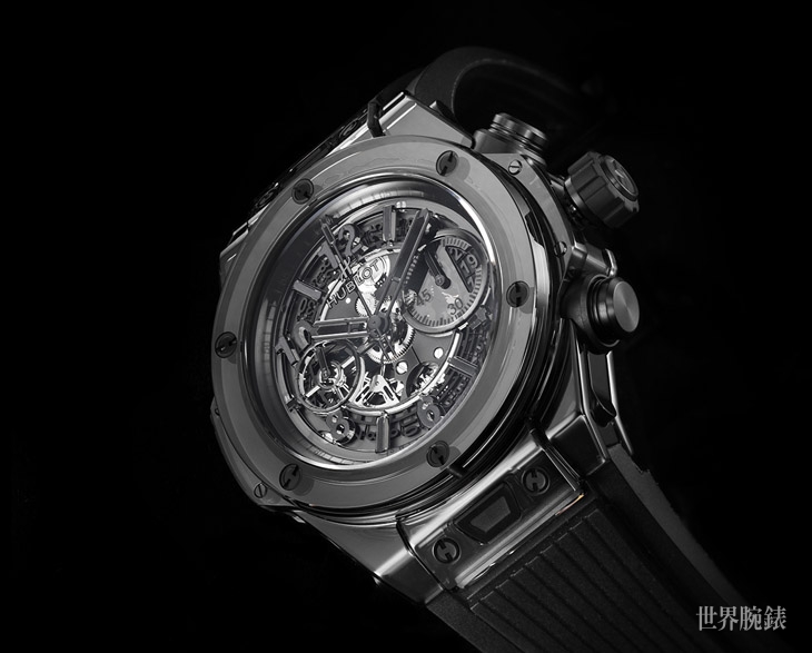 錶款以藍寶石水晶打造錶殼,形成獨特的視覺效果。品牌在打磨完成的藍寶石水晶之上覆以特殊的黒色金屬鍍層,強化色澤質感的同時,卻依然微妙地保有藍寶石水晶原本的視覺穿透性。佩戴者可以直接透過透視面盤飽覽Unico計時機芯的精緻美態,所有的機械結構與零件運作都盡收眼底。